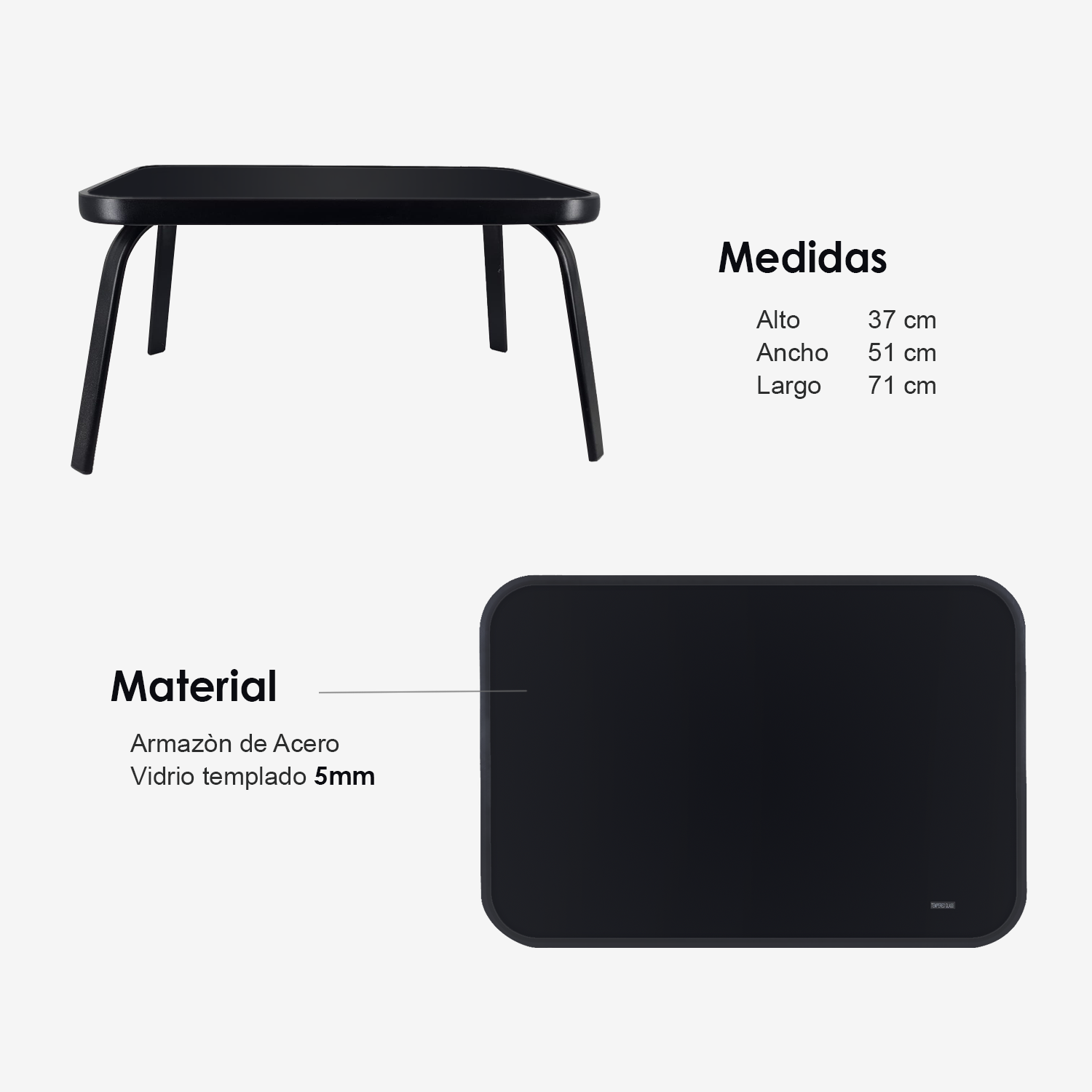 Mesa: Rectangular de acero con pintura epoxi, vidrio templado de 5 mm de espesor. Dimensiones: 71 x 51 x 38 cm.